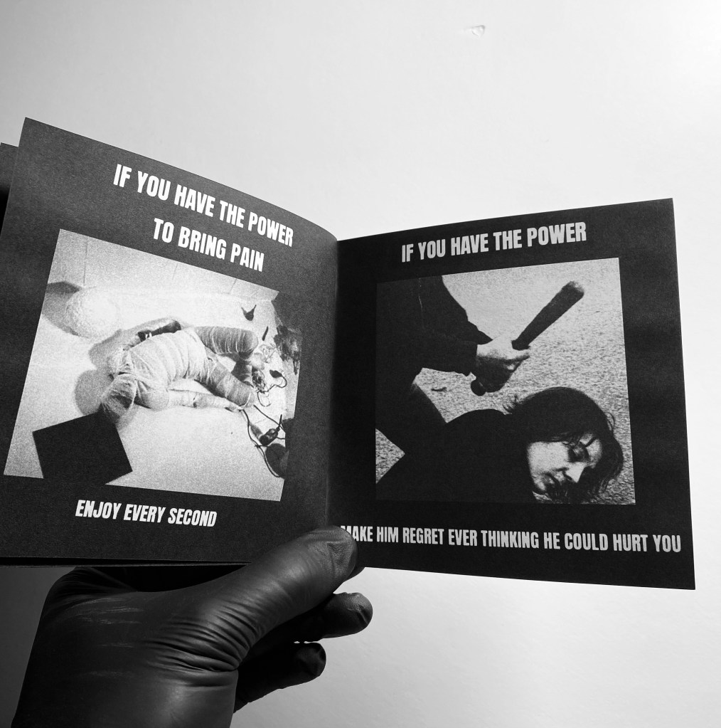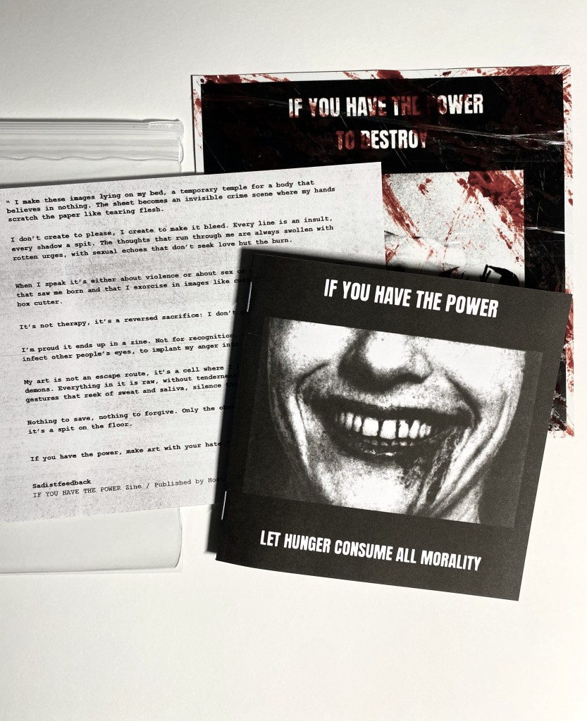 the work of sadistfeedback is unforgiving! harsh IMAGES and words by an artist that fumes with hate. this release contains a 16 page zine (13×13 cm), a personal writing by the author and a custom square print (16×16 cm).